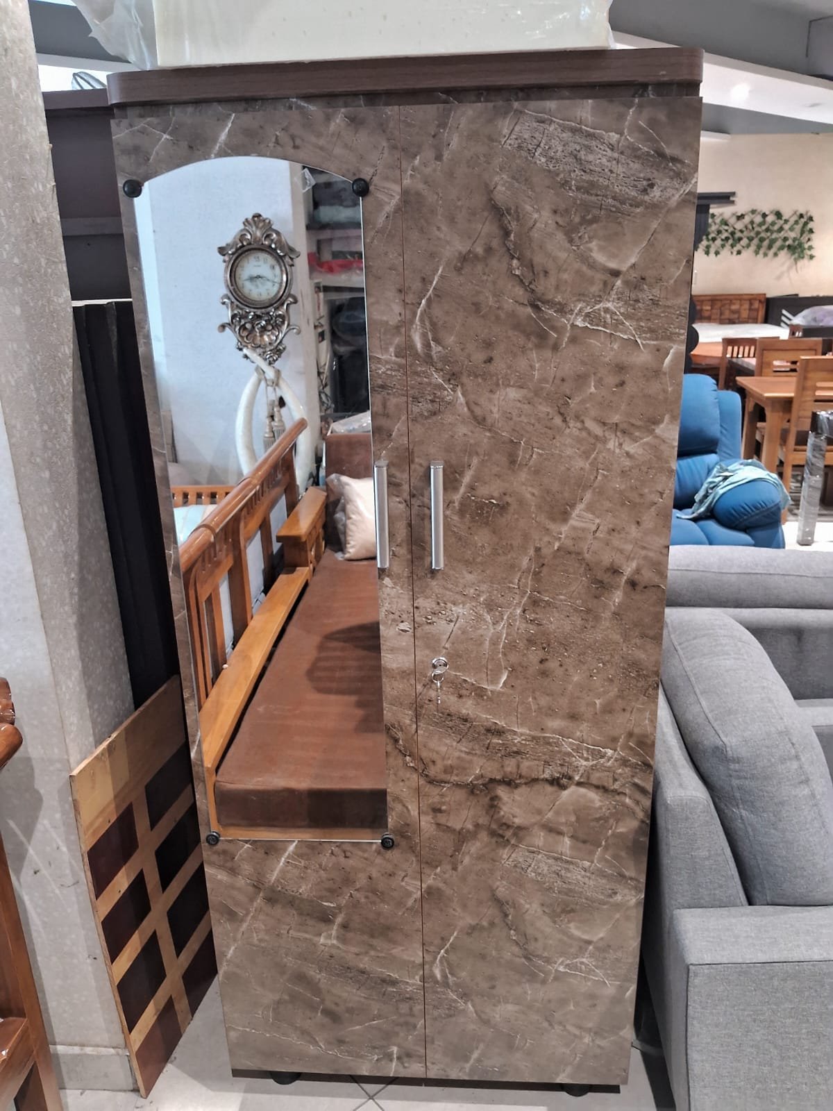 The Elegance Marble 2-Door Wardrobe is a stylish and functional storage solution that combines elegance with practicality. Crafted from high-quality materials, this wardrobe features sleek marble-like doors with a warm, earthy tone and natural veining, adding a touch of sophistication to any room. The silver handles provide a modern contrast, enhancing its overall aesthetic appeal. This versatile piece offers ample storage space for organizing clothing, accessories, or other essentials, making it an ideal choice for bedrooms or living spaces. With its premium quality and eco-friendly materials, the Elegance Marble Wardrobe is both durable and sustainable, ensuring long-lasting beauty and performance.
