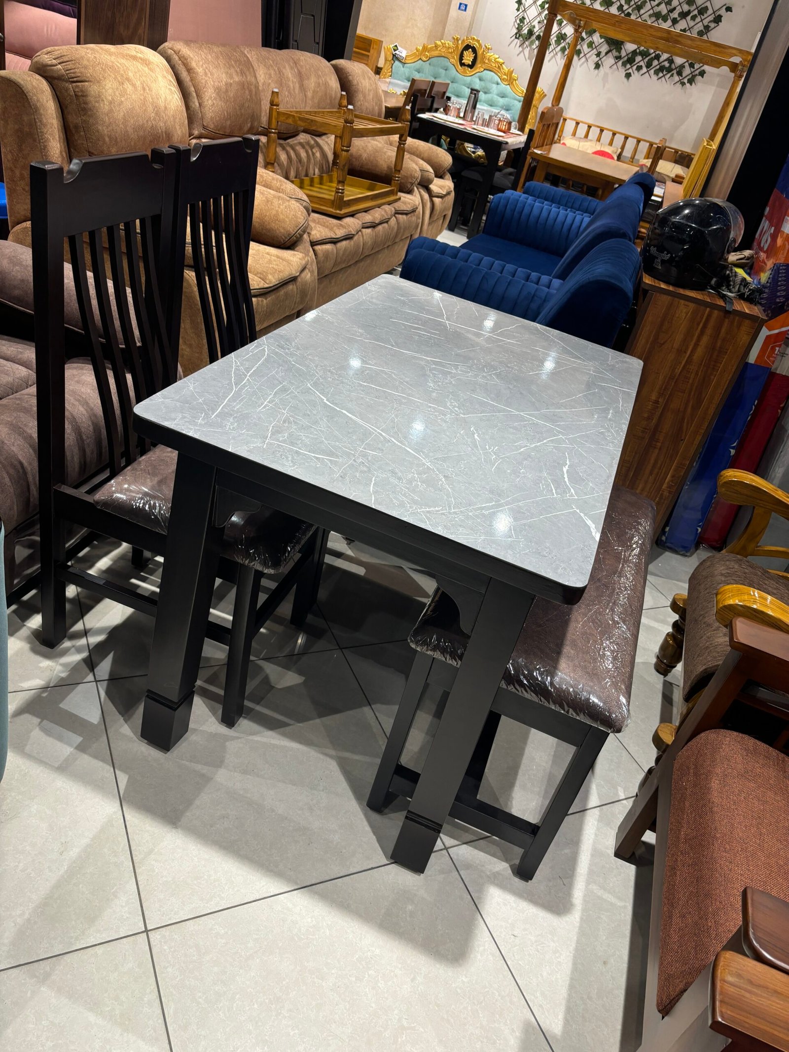 Lumina Marble-Top 2-Seater Dining Set with Bench is a sleek and sophisticated furniture collection designed for compact spaces without compromising on style or elegance. The set features a rectangular table with a luxurious marble-look top in soft gray or white tones, beautifully veined to mimic natural stone. This refined surface sits atop a sturdy frame finished in black or brushed gold, adding a touch of modern luxury. Complementing the table are two elegant dining chairs with neutral upholstered cushioned seats, offering comfort and support. A matching bench completes the set — perfect for additional seating or as a stylish accent piece in your dining or entryway space.