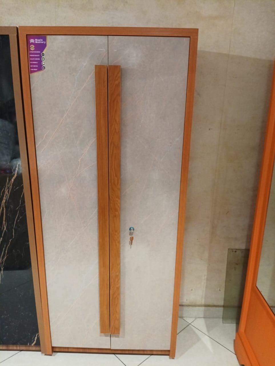 The Maple Essence 2-Door Wardrobe is a modern and stylish storage solution that combines elegance with functionality. Crafted from high-quality maple wood with a warm, natural finish, this wardrobe exudes sophistication and timeless charm. The sleek white doors feature subtle wood grain patterns, adding a touch of texture and visual interest to any room. The silver handles provide a contemporary contrast, enhancing its overall aesthetic appeal. This versatile piece offers ample storage space for organizing clothing, accessories, or other essentials, making it an ideal choice for bedrooms or living spaces. With its premium quality and eco-friendly materials, the Maple Essence Wardrobe is both durable and sustainable, ensuring long-lasting beauty and performance.