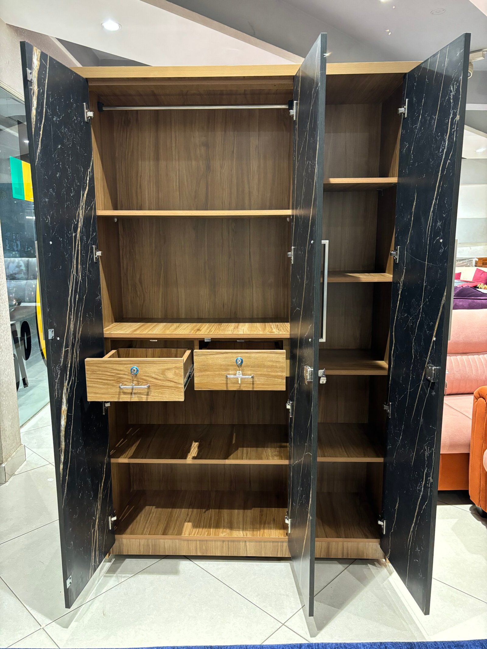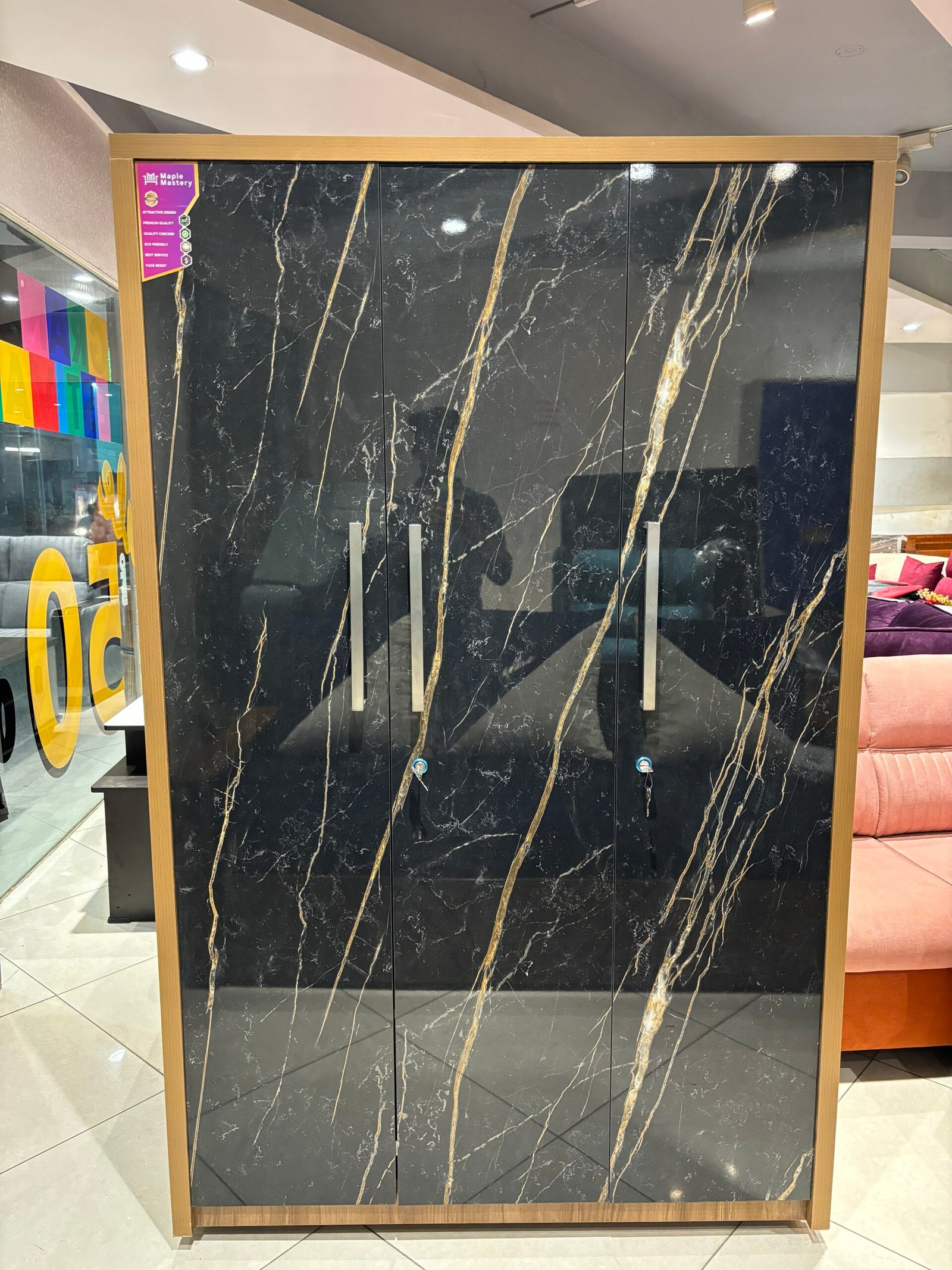The Maple Luxe Marble 3-Door Wardrobe is a stunning and luxurious storage solution that combines elegance with functionality. Crafted from high-quality maple wood with a warm, natural finish, this wardrobe exudes sophistication and timeless charm. The sleek black marble-like doors feature striking gold veining, adding a touch of opulence and visual interest to any room.. With its premium quality and eco-friendly materials, the Maple Luxe Marble Wardrobe is both durable and sustainable, ensuring long-lasting beauty and performance.