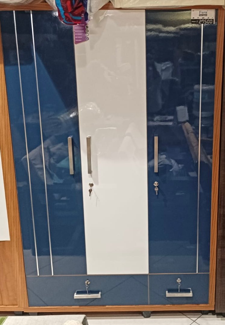 The Modern 3-Door Blue & White Wardrobe is a sleek and stylish storage solution that combines functionality with contemporary design. Crafted from high-quality materials, this wardrobe features bold blue doors with a glossy finish, complemented by clean white accents for a striking contrast. The silver handles add a modern touch, enhancing its overall aesthetic appeal. This versatile piece offers ample storage space for organizing clothing, accessories, or other essentials, making it an ideal choice for bedrooms or living spaces. With its premium quality and eco-friendly materials, the Modern 3-Door Blue & White Wardrobe is both durable and sustainable, ensuring long-lasting beauty and performance