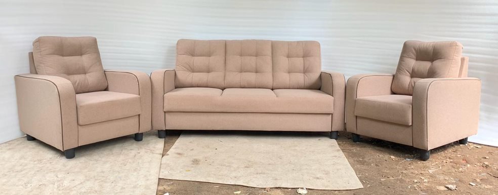 The Serene Beige Tufted Sofa Set is a modern and elegant seating solution designed to create a cozy and inviting atmosphere in any living space. Crafted with high-quality beige fabric, this sofa set features plush, tufted cushions that offer both style and comfort. The corner arrangement includes a three-seater sofa flanked by two single-seater armchairs, providing ample seating for family gatherings or entertaining guests. Its neutral beige color adds warmth and sophistication to the room, making it versatile for various interior styles. Ideal for those who seek both functionality and aesthetic appeal, the Serene Beige Tufted Sofa Set is a timeless choice for enhancing your home’s decor.