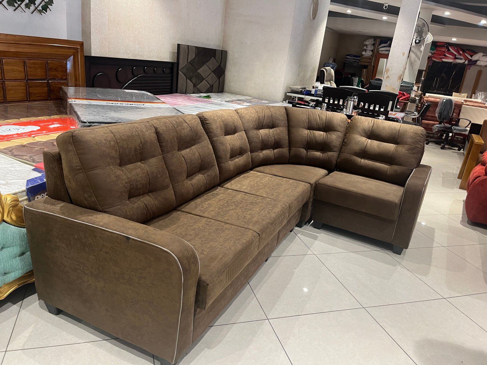 Elevate Your Living Space: The Venus Luxe Corner Sofa is designed to bring elegance and comfort to your home, featuring plush cushions and a sophisticated tufted design